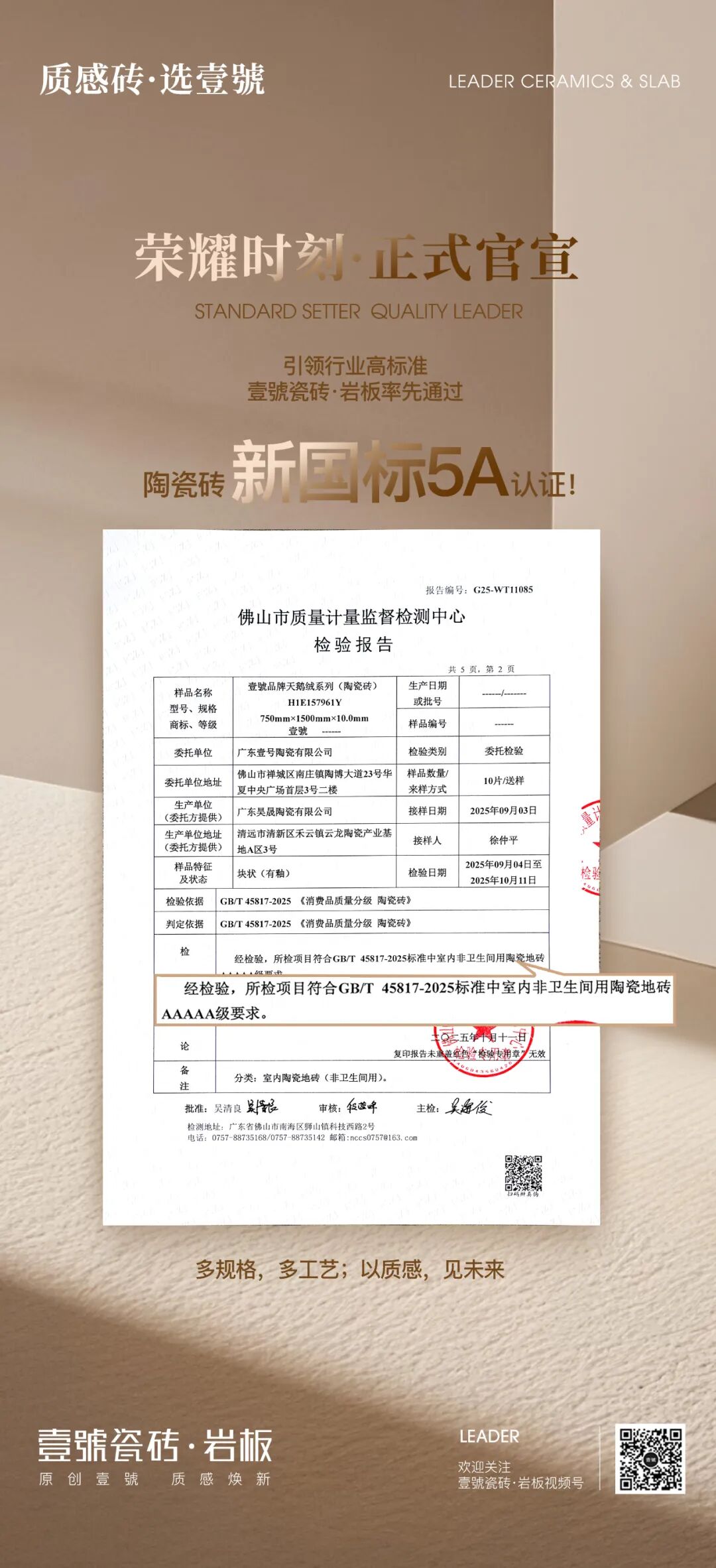 此次通過的5A國標(biāo),對陶瓷磚的耐磨度、抗污性、平整度、吸水率和藝術(shù)表現(xiàn)力設(shè)立了極為嚴(yán)苛的指標(biāo)。昊晟企業(yè)旗下壹號瓷磚·巖板送檢的產(chǎn)品在五大維度上均表現(xiàn)卓越,成功奪得首批認(rèn)證席位。這意味著一塊標(biāo)有“5A”標(biāo)識的壹號產(chǎn)品,即是耐用、易潔、平整、穩(wěn)定與美觀的代名詞,為消費者在紛繁的市場中選購真正的高端瓷磚提供了清晰、可靠的權(quán)威指引。